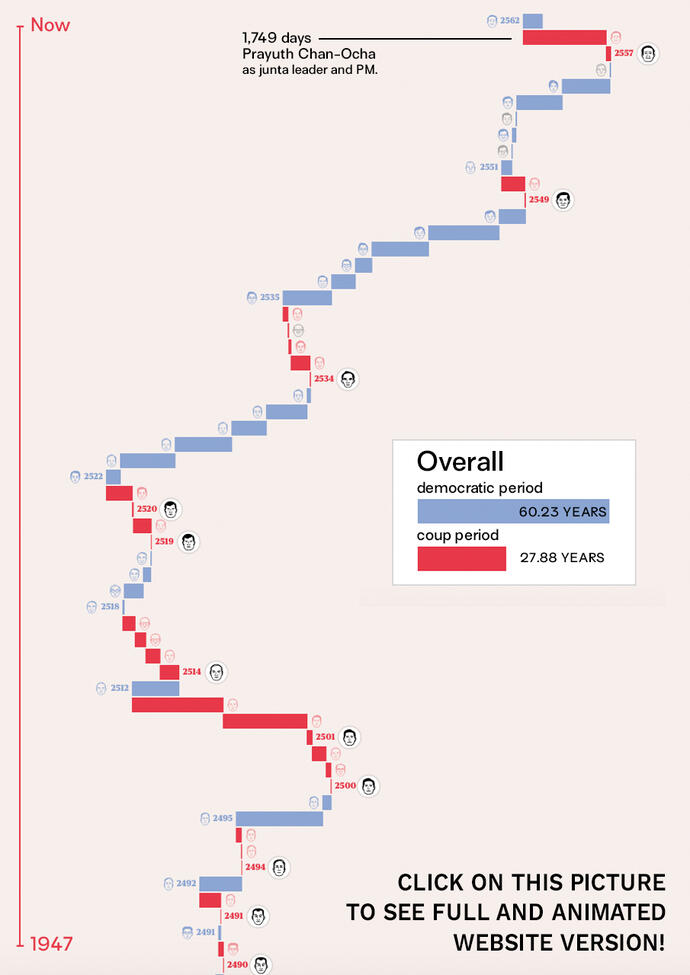 - one of the world's top ten countries with the most coups d'état and coup attmptsTHE MOST RECENT COUP, IN 2014, WAS LED BY GEN. PRAYUTH CHAN-O-CHA, WHO TOOK POWER AS THE JUNTA LEADER FOR 4 YEARS, AND IN 2019, THROUGH RIGGED ELECTIONS AND INVOLVEMENTS OF THE ELITES AND THE PALACE, HE BECAME THE PRIME MINISTER OF THAILAND